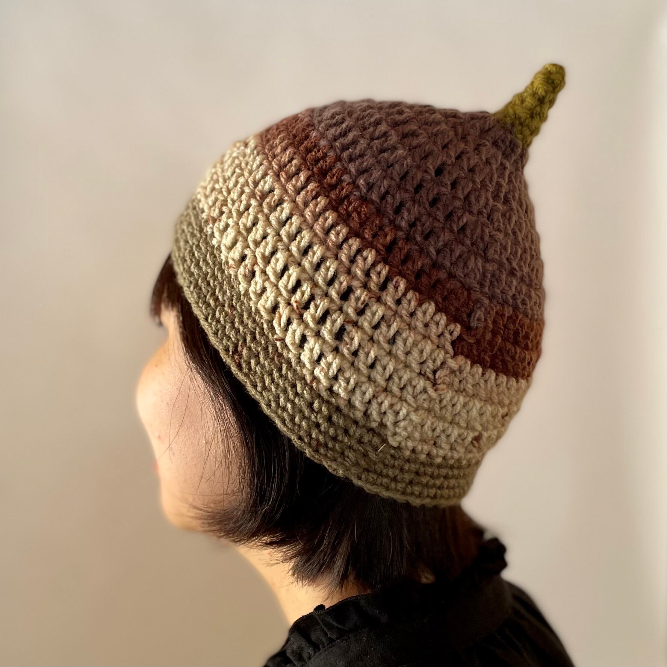 八ヶ岳山麓に広がる森に落ちている、どんぐりのかたちをしたニット帽です。