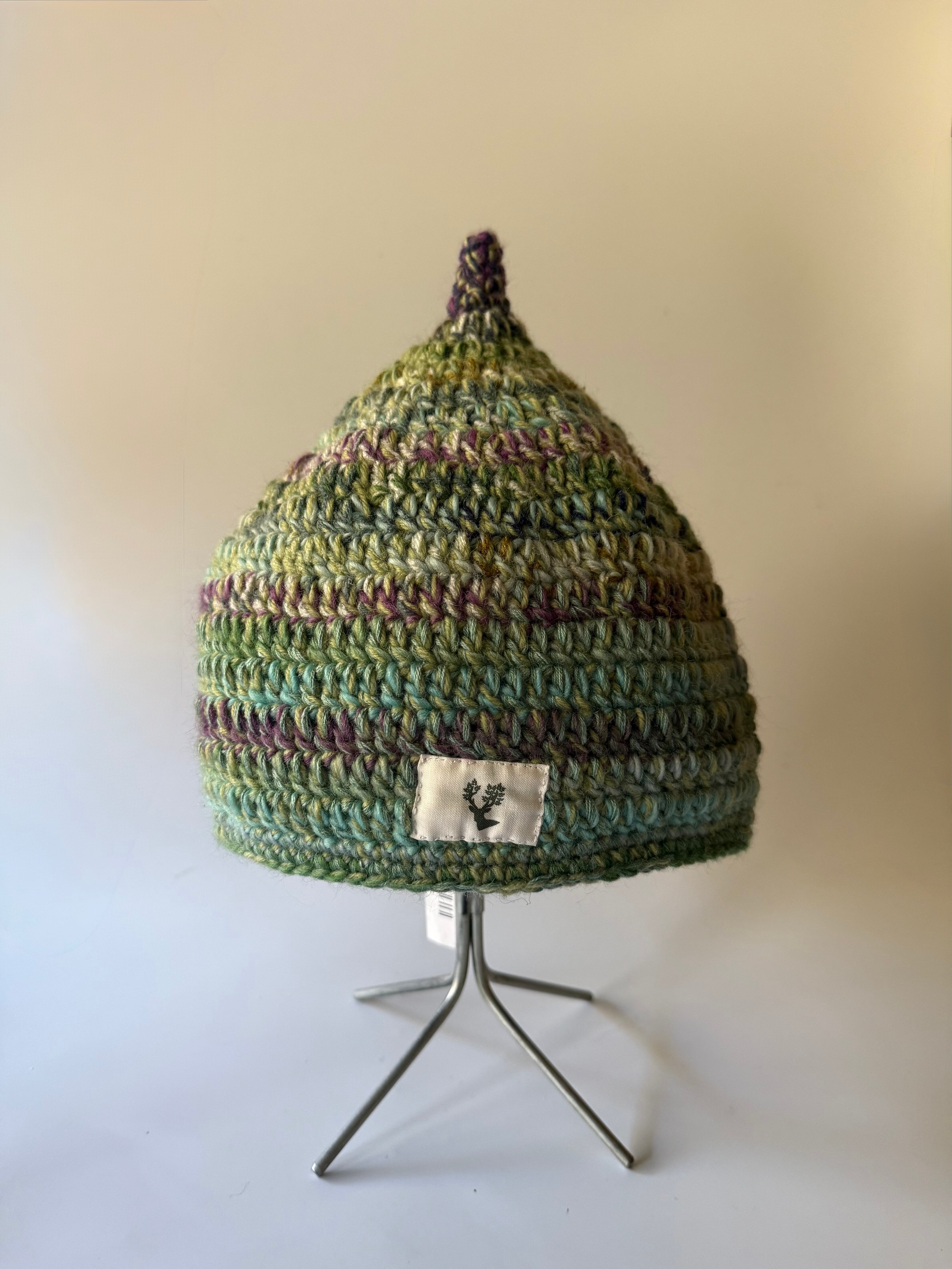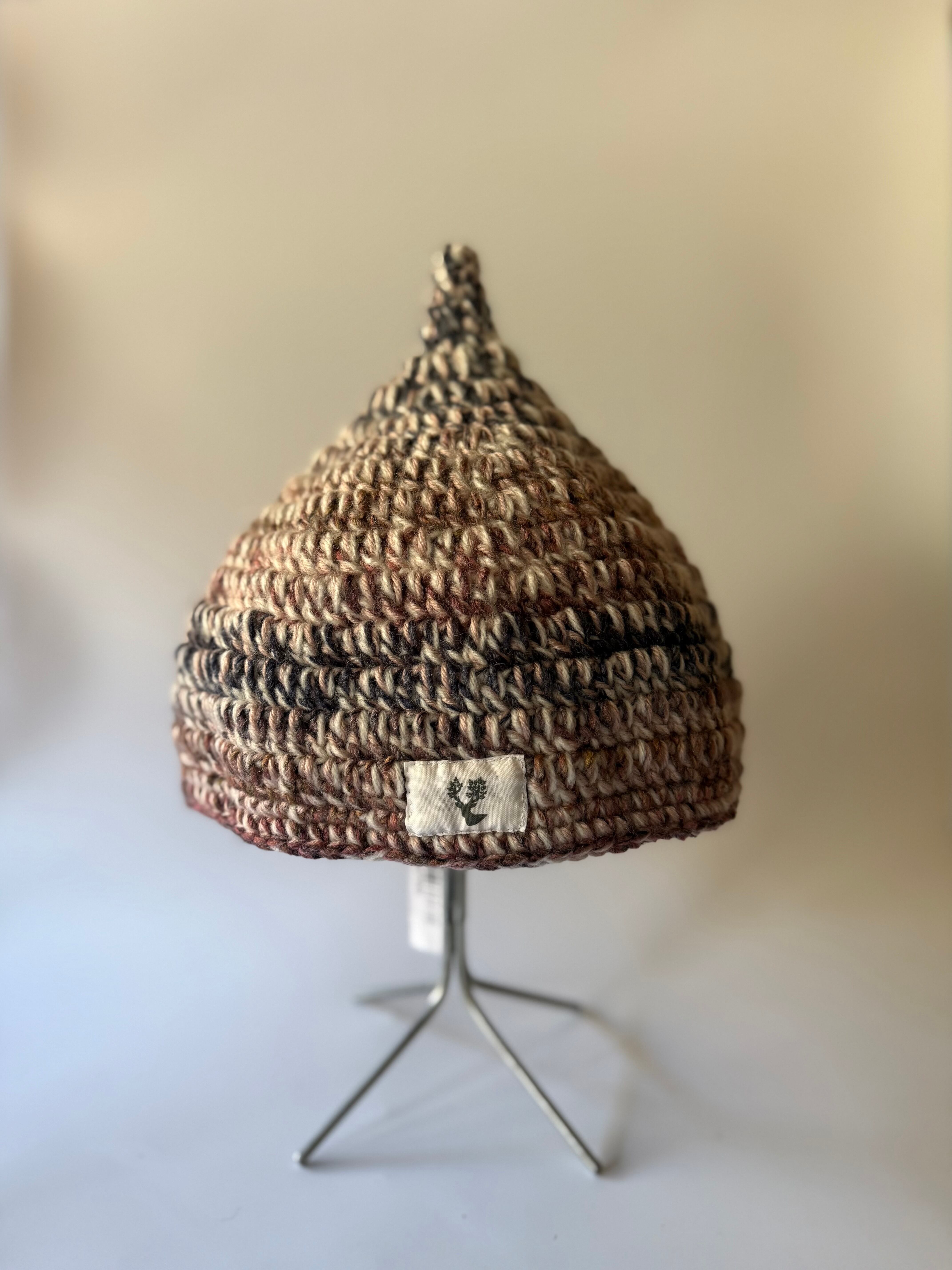 森の中のお散歩にぴったりです。アクリル素材のため、チクチクせず、程良い厚みと高い伸縮性が被りやすく、フィット感も快適な手づくりの帽子です。